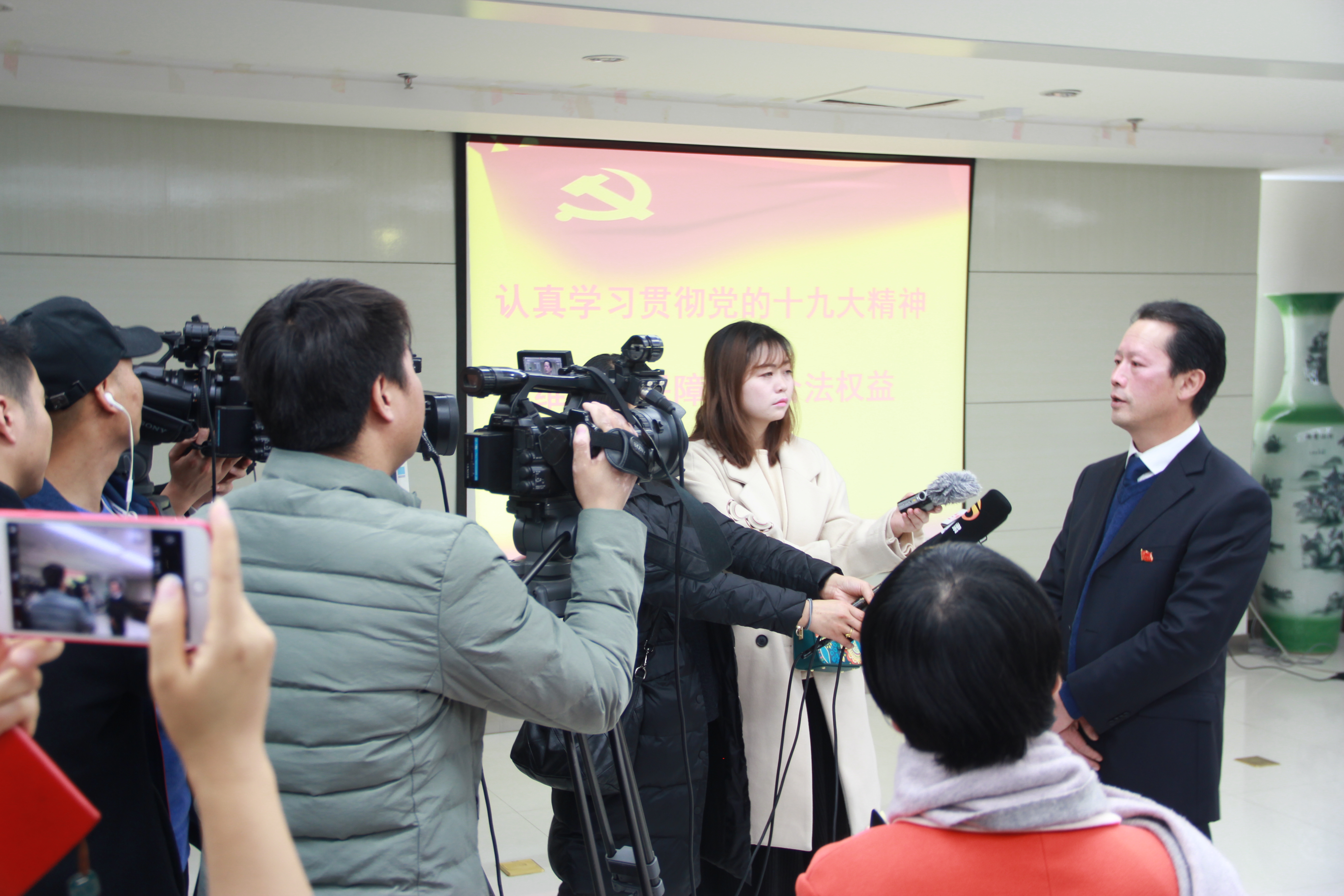 省信访局党组书记、局长秦仰贤带领局党组成员和各支部书记重温了入党誓词,随后接受了媒体采访。秦仰贤表示,学习宣传贯彻党的十九大精神是当前和今后一个时期首要的政治任务。近日,省委书记林铎对信访工作作出批示,要求“认真贯彻党的十九大精神,更加重视信访工作,把群众的事当成各级党委、政府的大事,认真解决好”,这为我们结合信访工作实际、学习贯彻十九大精神提出了新的、更高的、更具体的要求。前不久,我们邀请全国基层信访系统唯一的十九大代表、定西市信访局副局长赵贵成同志给全省信访干部作了一场生动感人的宣讲报告,在全省信访系统引起强烈反响,广大信访干部纷纷表示要学习赵贵成同志为党分忧,为民解难的精神和品质,在平凡的岗位上以实际行动来检验学习宣传贯彻党的十九大精神的成效。